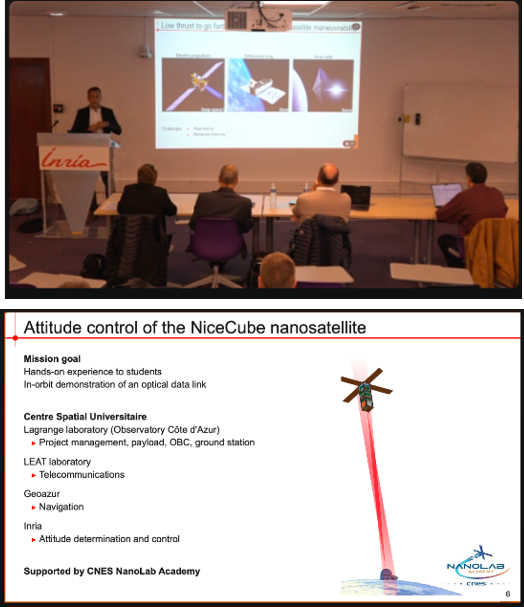 Le CSU Côte d’Azur est fier d'annoncer que le 22 octobre 2025 Lamberto Dell Elce a soutenu son Habilitation à Diriger des Recherches intitulée Geometric control of satellite trajectories with low-thrust propulsion, à l’INRIA. Lamberto travaille sur le contrôle d'attitude du satellite Nice Cube, la première mission spatiale du CSU et encadre chaque année des étudiants de Master sur ce sous-système critique pour notre premier satellite. Bravo à Lamberto !